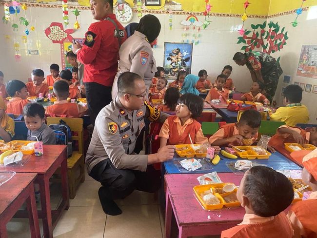 Polisi Sidoarjo membagikan makan siang bergizi untuk siswa-siswi TK. Kegiatan tersebut untuk mendukung program Asta Cita Presiden Prabowo Subianto.