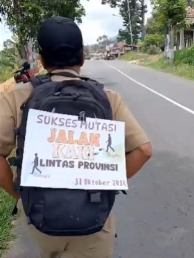 "Sukses Mutasi, jalan kaki lintas provinsi. 31 Oktober 2024," demikian tulisan yang dia kalungkan di leher dan dia tempelkan pada tas ransel di punggungnya tersebut.