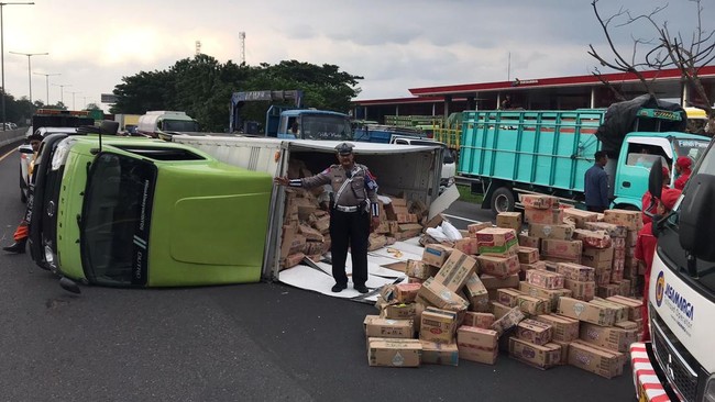 Truk Box berwarna hijau bernomor polisi B 9623 PCR yang dikemudikan oleh Asep Handokon (30) warga Gresik itu terguling sekitar pukul 15.00 WIB.
