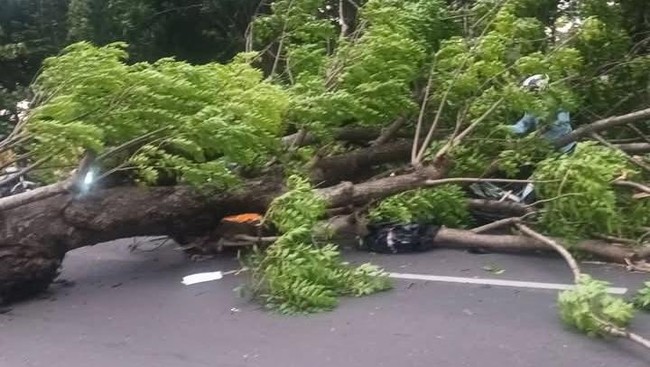 "Pohon yang tumbang tersebut sempat menutup jalan, dan menimpa seorang pengendara motor," kata Kharisma di lokasi kejadian.