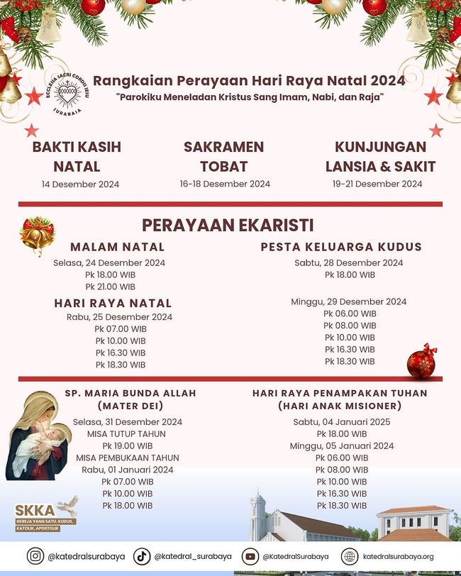 Gereja Katedral Surabaya telah merilis jadwal Misa Natal 2024. Umat Katolik yang ingin mengikuti perayaan Natal di Gereja Katedral dapat menyesuaikan dengan jadwal yang telah ditetapkan.