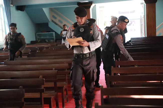 Sterilisasi dilakukan secara teliti dengan memeriksa seluruh area Gereja, mulai dari altar, tempat jemaat berkumpul, area parkir, dan di lokasi lainnya. Pada sterilisasi ini menggunakan alat detektor logam dan anjing pelacak.