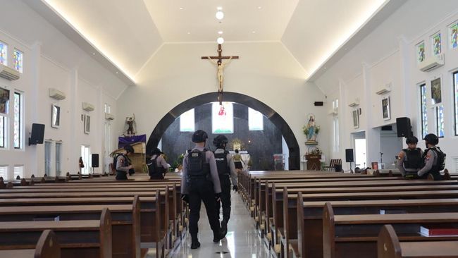 Salah satunya berada di Gereja Santo Mikael yang berlokasi di Jalan Tanjung Sadari, Surabaya. Di sana, petugas memeriksa satu persatu ruangan di gereja serta tempat duduk jemaat.