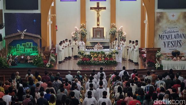 Pantauan detikJatim, ibadah Natal di Gereja Katolik Kristus Raja Surabaya berlangsung khidmat. Jemaat di dalam maupun luar gedung mulai melaksanakan ibadah pukul 07.30 WIB dipimpin Romo Yohanes Widayaka CM.
