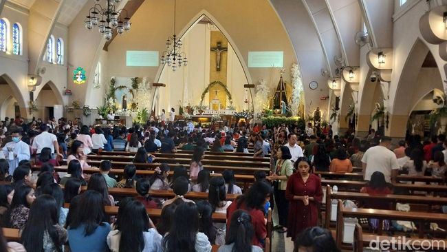 Dari pantauan detikJatim, terlihat gedung dengan kapasitas 700 orang itu dipadati jemaat. Bahkan, panitia sampai harus menyediakan kursi tambahan di halaman gereja untuk menampung jemaat yang berdatangan untuk mengikuti Misa.