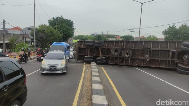Kecelakaan tunggal terjadi di layang Trosobo, Kecamatan Taman, Sidoarjo. Sebuah truk trailer bermuatan kontainer tidak kuat nanjak terguling hingga menutup badan jalan.