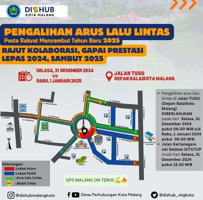 "Untuk Jalan Tugu depan Balai Kota Malang akan ditutup pada hari Selasa (31/12/2024) pukul 06.00 WIB sampai Rabu (1/1/2025) pukul 06.00 WIB," terang Widjaja.