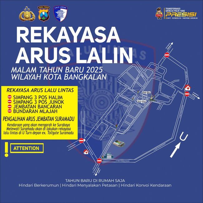 Sejumlah ruas jalan di Bangkalan dilakukan penyekatan saat perayaan tahun baru 2025 malam nanti. Ini dilakukan demi mencegah kerumunan massa dalam jumlah yang banyak.