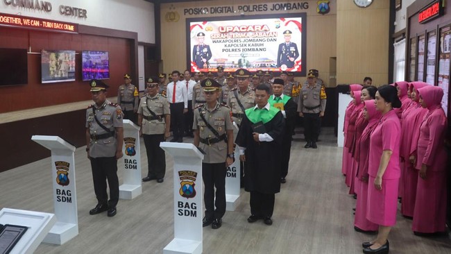 Polres Jombang menggelar upacara serah terima jabatan (Sertijab) Wakapolres dan Kapolsek yang dimutasi. Upacara dipimpin langsung Kapolres AKBP Eko Bagus Riyadi.