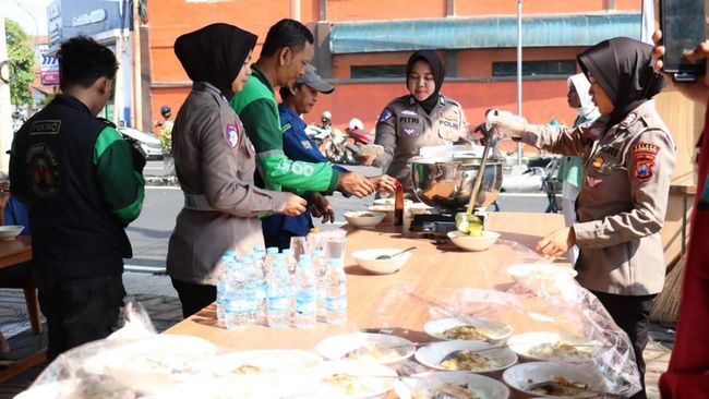 Makan gratis di Cangkrukan Mahameru, Pos 12.06 Polres Mojokerto Kota diserbu warga mulai pagi tadi. Para pengendara yang melintas di Jalan Benteng Pancasila untuk menikmati semangkuk soto ayam.