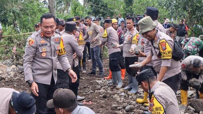 Pantauan di lokasi, para personil kepolisian itu tampak bergabung dengan tim berasal dari unsur lainnya. Mereka turut membersihkan sisa material yang terbawa banjir bandang.