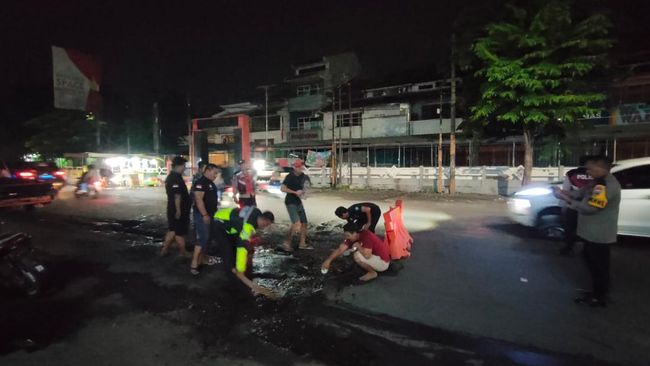 Polisi dan relawan bergerak bersama peduli keselamatan pengendara dari bahaya jalan rusak di Jalan Basuki Rahmat, Pasar Krian, Sidoarjo. Mereka melakukan kerja bakti bareng menambal jalan berlubang, Sabtu (11/1/2025) malam.