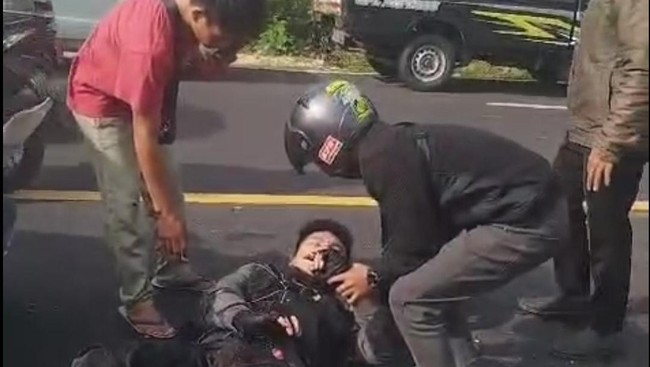 Sebuah video kecelakaan tersebar di grup WhatsApp. Tampak di video itu pengendara terkapar di depan mobil warna putih yang ringsek bagian depannya.