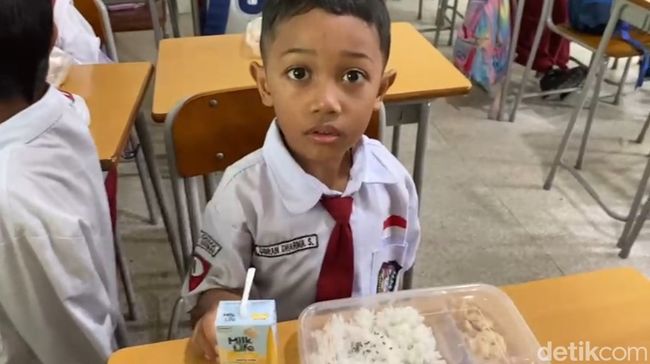 Makan bergizi gratis (MBG) di Surabaya hari ini telah dimulai. Salah satu siswa kelas 1 SD Taquma, Gibran Dharma mengaku tak suka dengan menu hari pertama MBG.