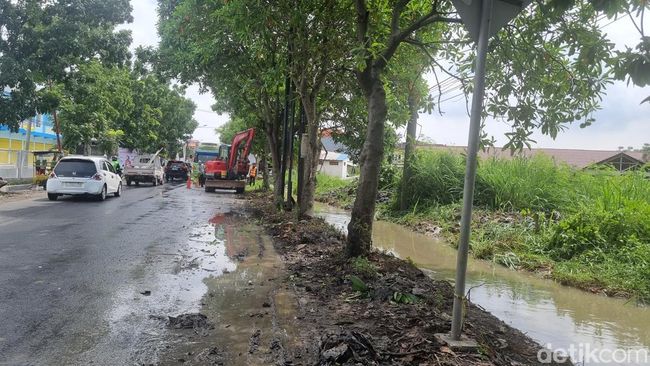 Sering tergenang air hingga dikira banjir, saluran air di Jalan Raya KH Syafii, Manyar, Gresik dibongkar. Saluran air tersebut ternyata mampet karena tertutup oleh tanah urukan.