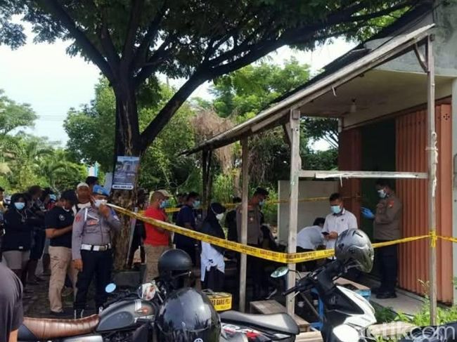 Warung dengan pintu berwarna oranye itu kini telah dipasangi garis polisi. Warga sekitar masih tampak berkerumun di lokasi, penasaran dengan kejadian yang menghebohkan tersebut.