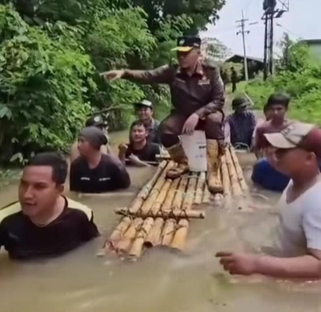 Dalam video itu terlihat Sjobirin menggunakan pakaian dinas lengkap sedang naik rakit bak 'raja.' Terlihat, 10 orang diduga merupakan bawahannya sedang memegangi rakit tersebut menerjang banjir setinggi dada orang dewasa.