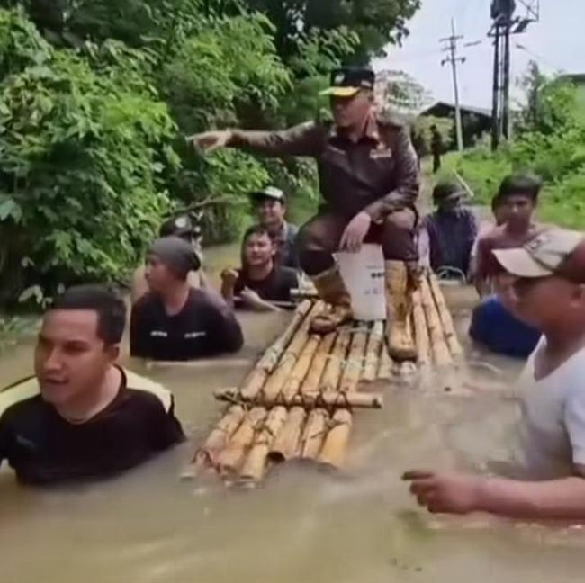 Dalam video itu terlihat Sjobirin menggunakan pakaian dinas lengkap sedang naik rakit bak 'raja.' Terlihat, 10 orang diduga merupakan bawahannya sedang memegangi rakit tersebut menerjang banjir setinggi dada orang dewasa.