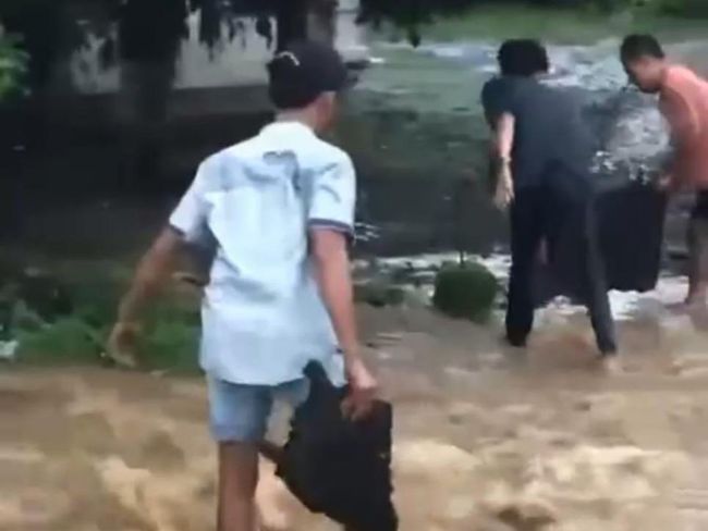 Dalam video pendek berdurasi 8 detik itu tampak warga yang berada di ruas jalan sedang bergotong royong memindahkan potongan aspal yang mengelupas. Potongan aspal berwarna hitam itu berada di derasnya air banjir