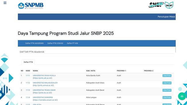 Dalam daftar daya tampung SNBP 2025, terdapat 76 PTN, 44 PTN vokasi atau politeknik, dan 26 perguruan tinggi keagamaan Islam negeri (PTKIN). Seluruhnya memuat informasi kuota prodi jenjang D3, D4, dan S1.