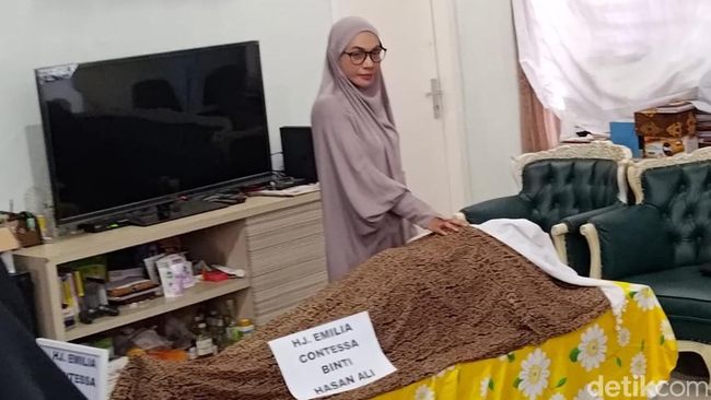Denada, artis yang juga putri dari Emilia Contessa tak kuat menahan tangis saat di depan jasad ibunya. Dia bersimpuh dan memanjatkan doa untuk sang ibunda.