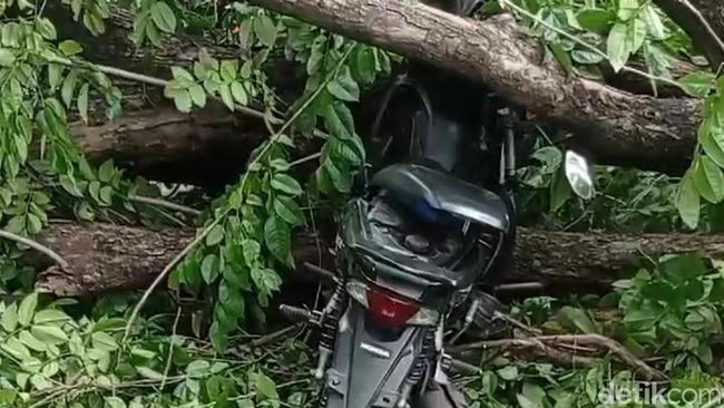 Pohon Sonokeling besar di tepi Jalan Raya Pasuruan-Purwosari, Desa Sambisirah, Kecamatan Wonorejo, Kabupaten Pasuruan tumbang. Pohon tumbang menimpa dua pemotor berboncengan yang melintas.