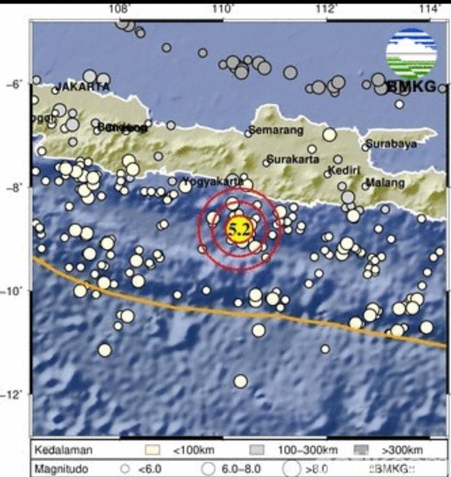 BMKG menginformasikan Gempa M 5.2 terjadi pukul 07.40 WIB. Lokasinya berada pada 8.81 LS, 110.31 BT atau 96 km Barat Daya Gunungkidul, DIY dengan kedalaman 10 Km.