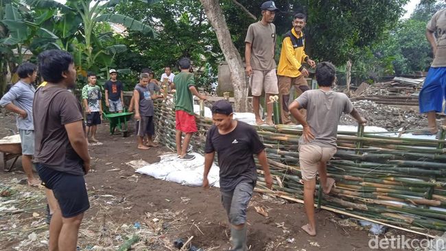 Panjang anyaman bambu sepanjang 50 meter. Proses pemasangan melibatkan warga setempat.