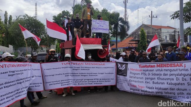 Ratusan warga desa setempat menggelar aksi demonstrasi di depan Kantor Kejari Sidoarjo untuk menuntut penuntasan kasus tersebut.