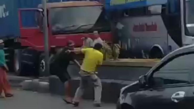 Beberapa saat kemudian sopir truk itu keluar membawa besi dan menyerang kedua pria itu secara membabi buta. Dia terus menyerang keduanya meski dikeroyok.