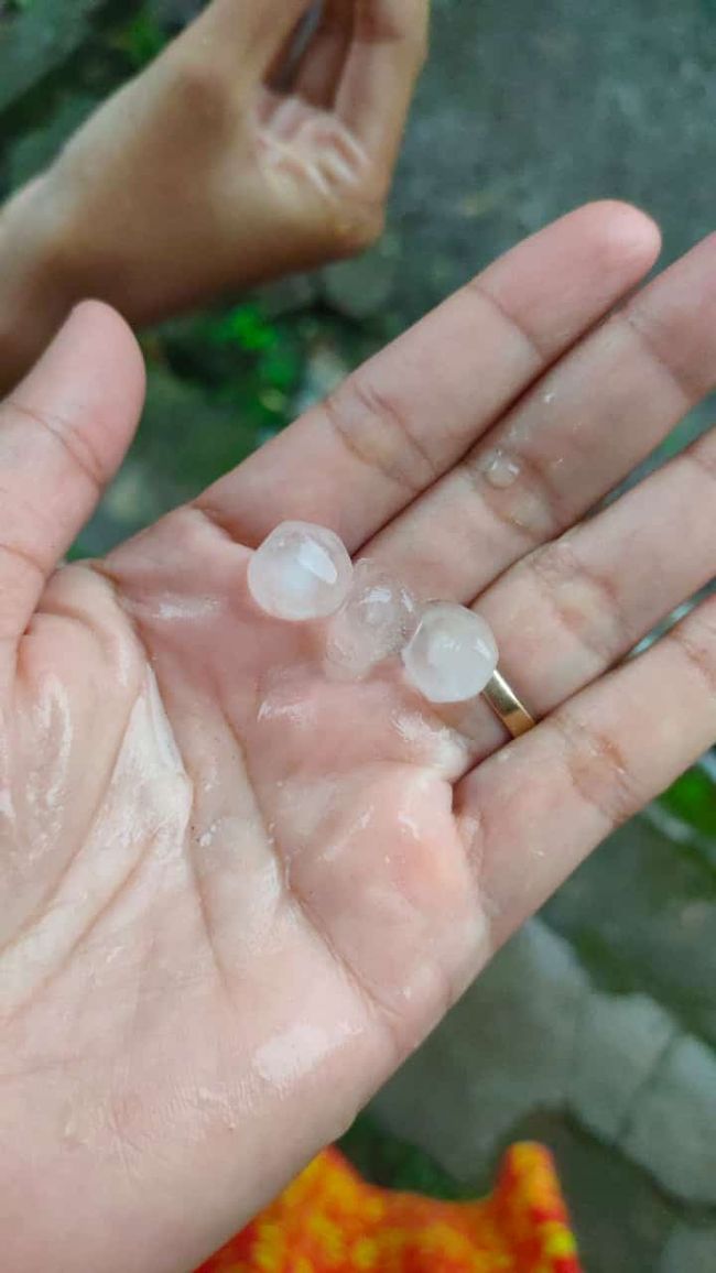 Yuni mengaku bahwa sang suami dan anak sempat memunguti butiran es di depan rumahnya sambil membawa payung.