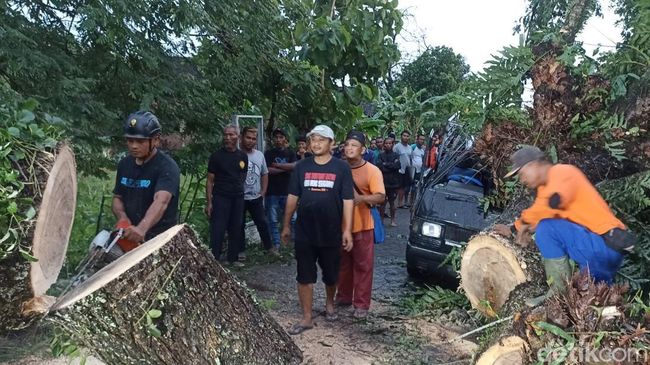 Pohon tumbang menimpa pikap di jalan kampung Desa Gentong Kecamatan Paron, Ngawi. Tiga orang mengalami luka dilarikan ke RS At-Tin Ngawi.