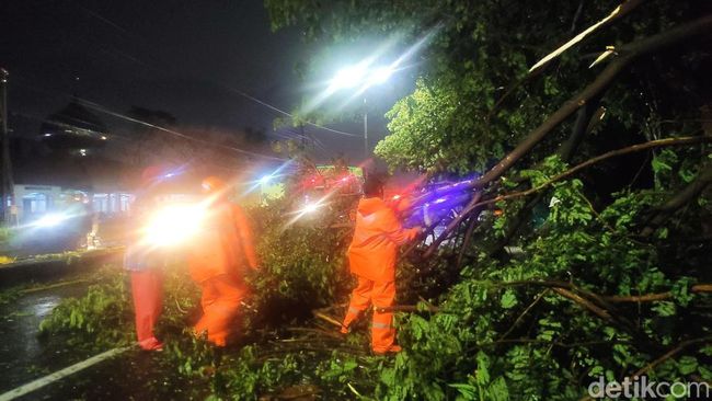 Pantauan dari detikJatim di lokasi puluhan petugas BPBD dan Satpol PP Sidoarjo sedang memotong pohon yang tumbang di tengah Jalan Raya Porong Lama dari arah Surabaya ke Malang.