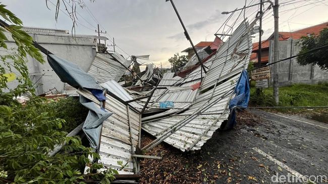 Titik kedua terdampak angin kencang di Kelurahan Blooto, Prajurit Kulon, Kota Mojokerto. Sebuah warkop ambruk total, atapnya berbahan galvalum terbang hingga menutup jalan.