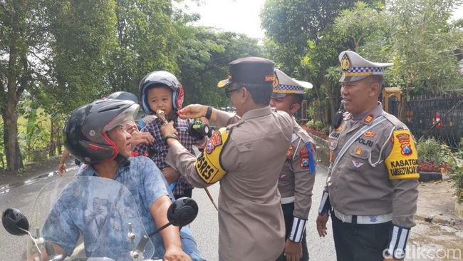 Hari pertama pelaksanaan Operasi Keselamatan Semeru 2025, Polres Trenggalek membagikan belasan helm gratis ke pengguna jalan. Salah satu sasarannya adalah anak-anak.