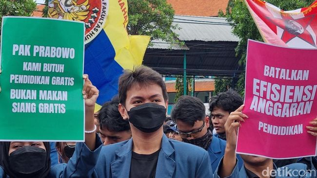 Ribuan mahasiswa dari beberapa kampus di Surabaya menggeruduk DPRD Jatim. Mereka unjuk rasa menyorot kebijakan Prabowo Subianto yang dinilai tidak berpihak pada rakyat.