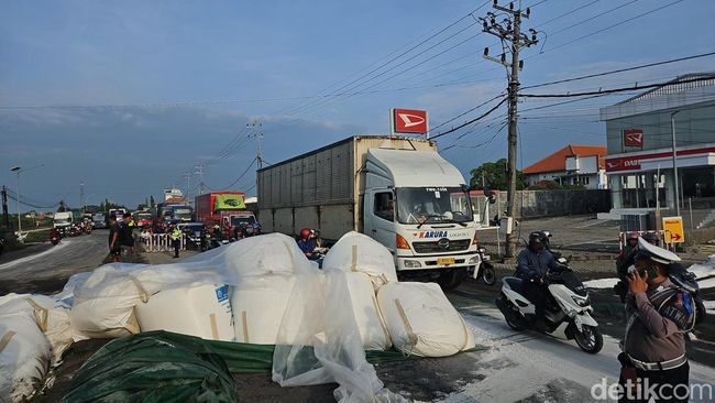 "Truk bermuatan gula pasir seberat 38 ton teguling akibat pecah ban depan di Jalan Raya Lamongan-Babat, tepatnya di Dusun Gajah, Desa Rejosari, Kecamatan Deket, Kamis (20/2/2025) sekitar pukul 23.20 WIB," kata Ipda Hadi Siswanto kepada wartawan, Jumat (21/2/2025).