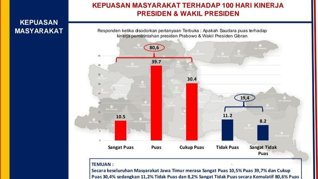 Accurate Research and Consulting Indonesia (ARCI) merilis hasil survei tentang kepuasan warga Jatim terhadap kinerja Prabowo Subianto-Gibran Rakabuming Raka di 100 hari pertama bekerja. Hasilnya, 80,6% warga Jatim puas kinerja Prabowo-Gibran.