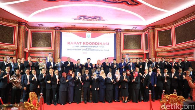 Gubernur Jawa Timur Khofifah Indar Parawansa usai dilantik langsung tancap gas menggelar rapat koordinasi bersama jajaran Kepala OPD Pemprov Jatim di Kraton Majapahit, Jakarta. Dia minta seluruh jajaran tak sekadar jalankan program tapi berlari mewujudkan Jatim sebagai Gerbang Baru Nusantara.
