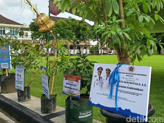 Ada pemandangan menarik di halaman Pendopo Kabupaten Pacitan. Beragam jenis bibit tanaman tampak ditata berderet persis di depan kantor pusat pemerintahan itu. Di tiap batang tanaman dibubuhi papan nama bertuliskan ucapan selamat atas dilantiknya pasangan kepala daerah Indrata Nur Bayuaji-Gagarin.