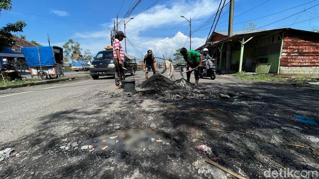 Warga menambal jalan rusak tersebut dengan pasir, batu dan semen dengan menggunakan biaya patungan. M Zainulllah (43) salah satu warga menuturkan bahwa jalan berlubang tersebut, sudah banyak memakan korban.