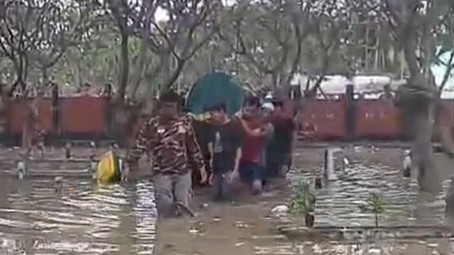 Dalam video berdurasi 2 menit itu terlihat sejumlah warga menggotong jenazah di tengah makam yang tergenang banjir. Mereka tampak berjalan pelan-pelan agar tidak sampai terantuk batu nisan.