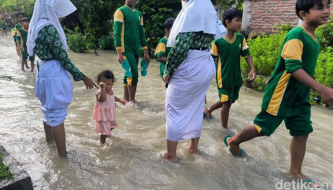 Pantauan detikJatim di lokasi, ketinggian genangan sudah mencapai 20 sentimeter di jalan desa. Warga yang hendak beraktivitas terpaksa menerobos banjir.