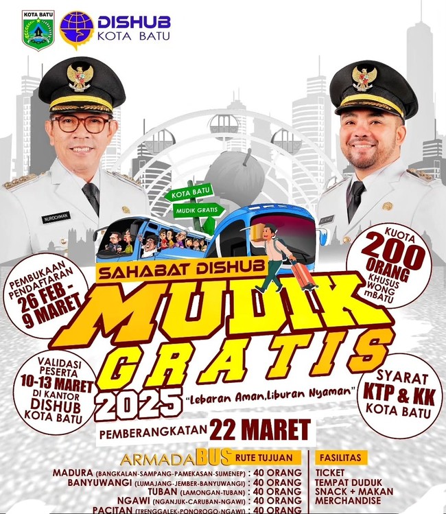 Pemerintah Kota (Pemkot) Batu melalui Dinas Perhubungan (Dishub) Kota Batu menyediakan program mudik gratis pada Lebaran 2025. Program ini baru pertama kali diselenggarakan di Kota Batu.