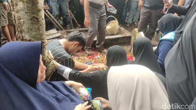 Suasana semakin haru saat jenazah dimasukkan ke liang lahat yang berdekatan dengan makam orang tua dan mertuanya.