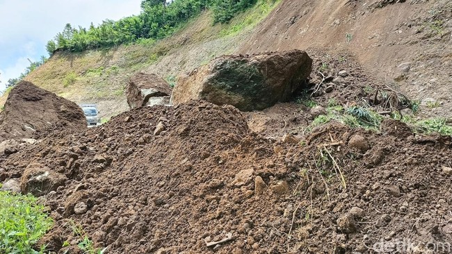 Pantauan detikJatim, material tanah longsor setinggi 3 meter disertai batu besar menutup bahu jalan. Beruntung peristiwa longsor tersebut tidak sampai menyebabkan korban.