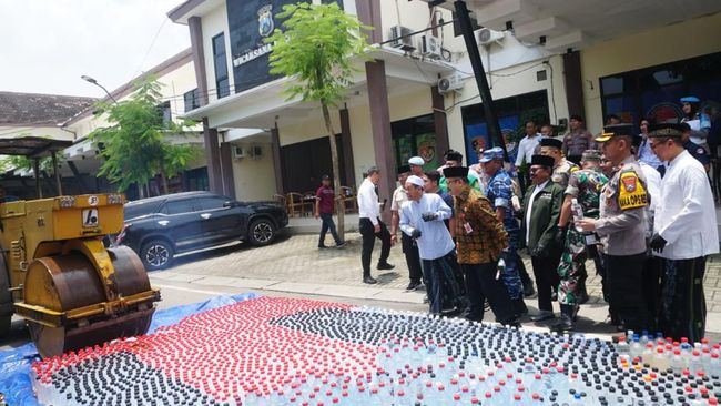 Pemusnahan miras dipimpin Kapolres Jombang AKBP Ardi Kurniawan di halaman kantor Satreskoba. Sebanyak 5.122 botol miras berbagai jenis dan merek digilas menggunakan alat berat. Pemusnahan disaksikan jajaran Forkopimda dan ulama.