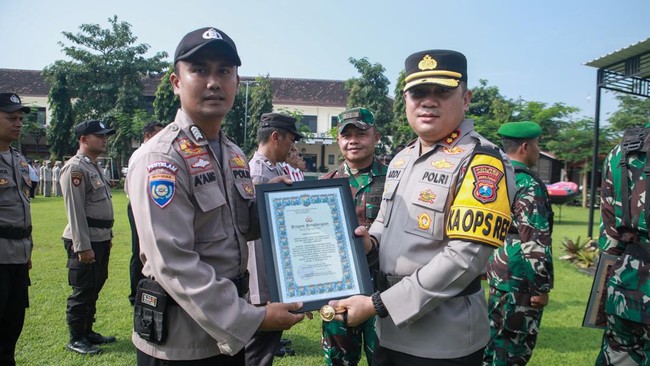 Penghargaan dari Polres Jombang diterima 28 personel polisi dan 3 anggota Kodim 0814 Jombang. Piagam penghargaan diserahkan Kapolres Jombang AKBP Ardi Kurniawan saat apel.