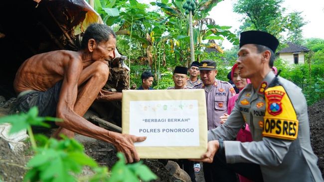 Polres Ponorogo melakukan bakti sosial kepada salah satu warga di Desa Watubonang, Kecamatan Badegan. Bantuan berupa sembako diberikan langsung oleh Kapolres Ponorogo, AKBP Andin Wisnu Sudibyo kepada Boinem, warga yang membutuhkan.