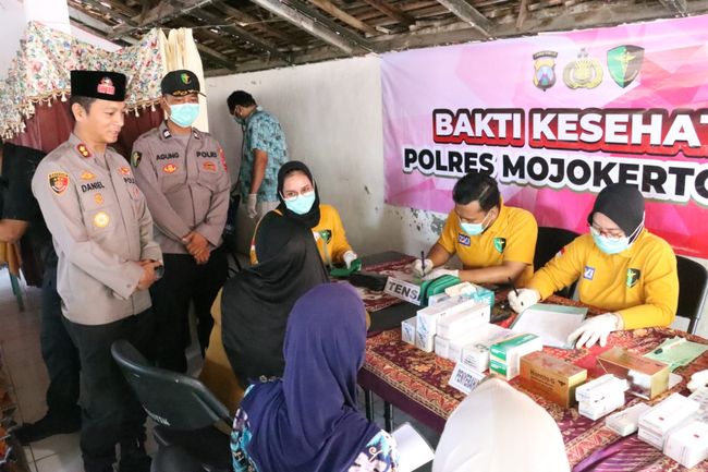 Polisi bersama Bhayangkari menggelar pemeriksaan kesehatan (rikes) gratis dan menyalurkan 1 ton beras ke warga miskin di Kota Mojokerto. Aksi Jumat Berkah ini untuk membantu kebutuhan pangan masyarakat sekaligus menjaga kesehatan mereka.